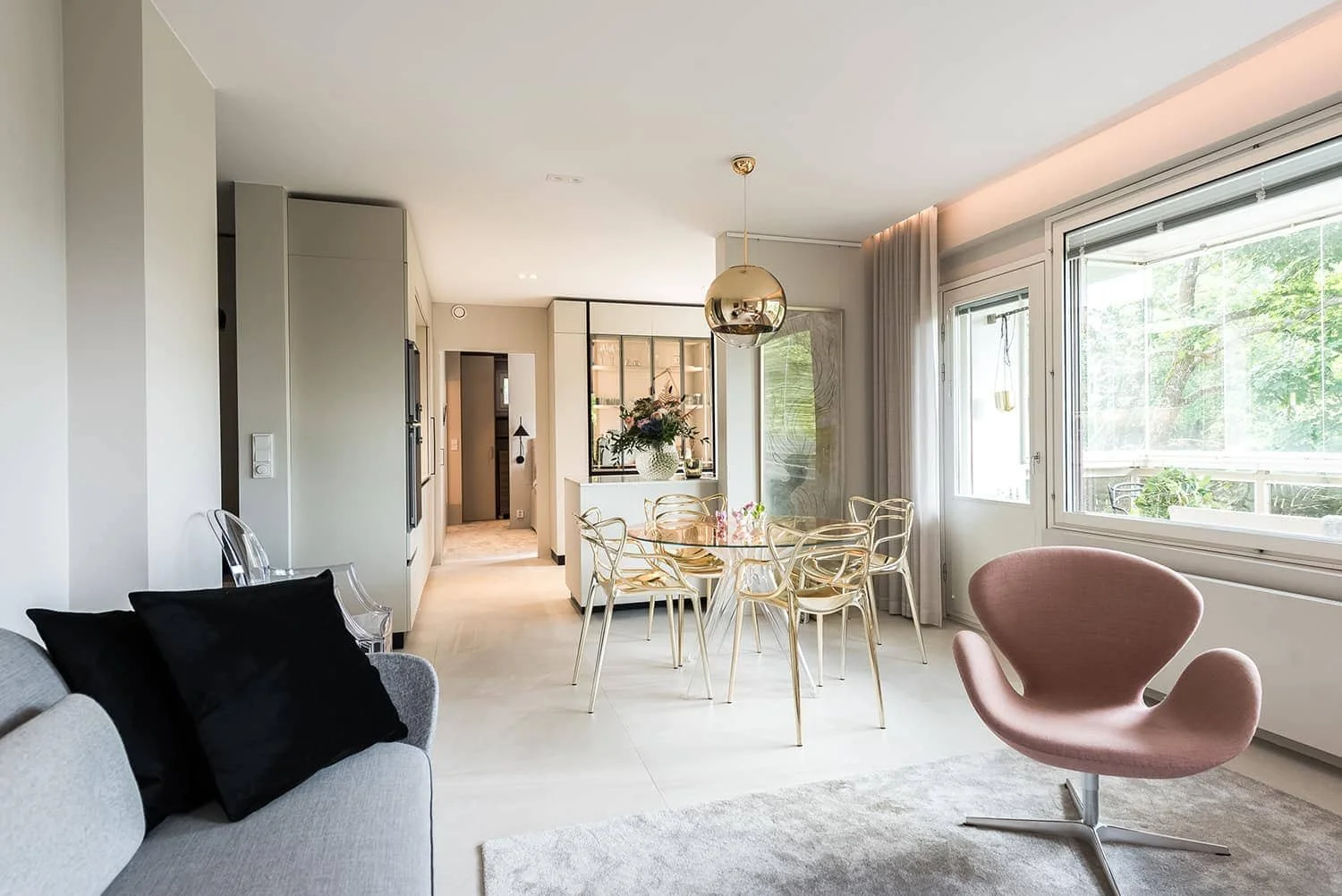 Upea 95m2 asunto muuntautui toimivaksi ja moderniksi perheen kodiksi, josta haluttiin tehdä kauniilla materiaaleilla ajaton ja klassisen tyylikäs koti tälle perheelle kymmeniksi vuosiksi.